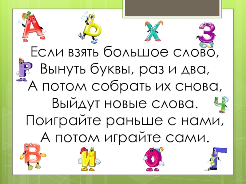 Если взять большое слово, Вынуть буквы, раз и два, А потом собрать их снова, Выйдут новые слова. Поиграйте раньше с нами, А потом играйте сами.