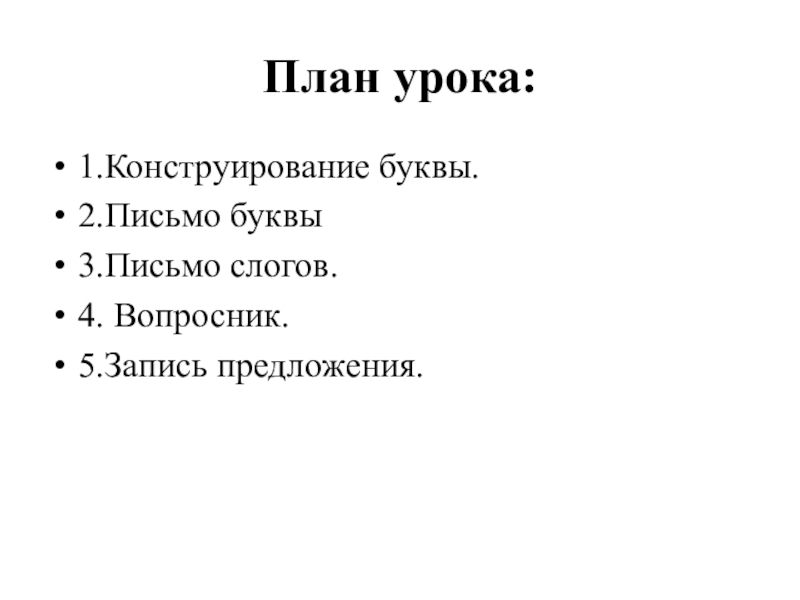 План урока:1.Конструирование буквы.2.Письмо буквы 3.Письмо слогов.4. Вопросник.5.Запись предложения.