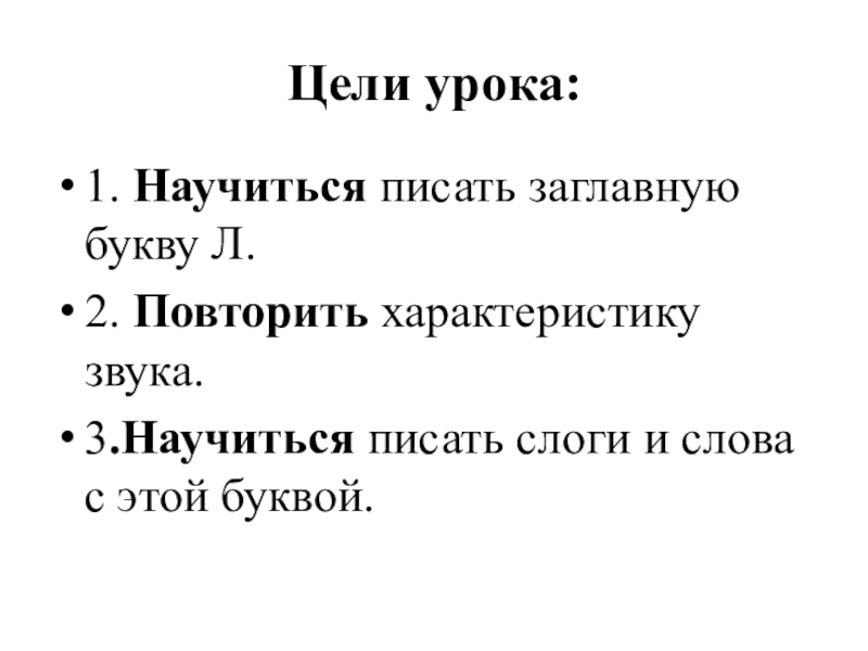 Цели урока:1. Научиться писать заглавную букву Л.2. Повторить характеристику звука.3.Научиться писать слоги и слова с этой буквой.