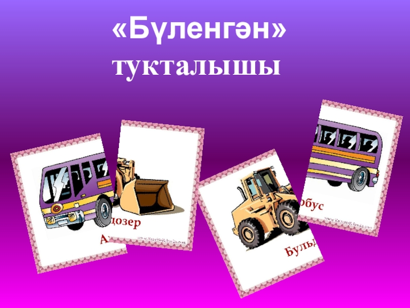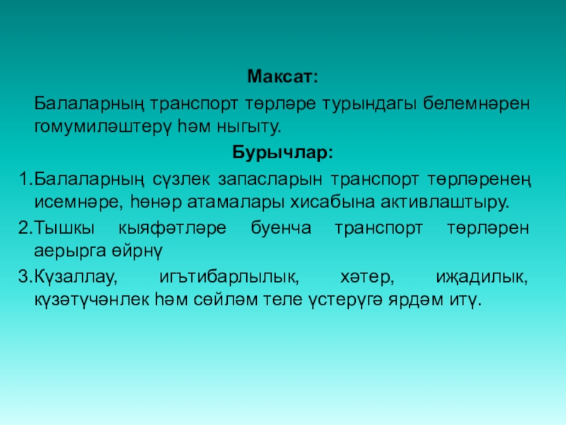 Максат:  Балаларның транспорт төрләре турындагы белемнәрен гомумиләштерү һәм ныгыту. Бурычлар:Балаларның сүзлек запасларын транспорт төрләренең исемнәре, һөнәр атамалары хисабына активлаштыру. Тышкы кыяфәтләре буенча транспорт төрләрен аерырга өйрнүКүзаллау, игътибарлылык, хәтер, иҗадилык, күзәтүчәнлек һәм сөйләм теле үстерүгә ярдәм итү.