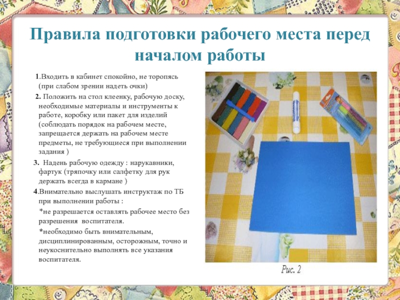 2. Положить на стол клеенку, рабочую доску, необходимые материалы и инструменты к работе, коробку или пакет для изделий (соблюдать порядок на рабочем месте, запрещается держать на рабочем месте предметы, не требующиеся при выполнении задания )