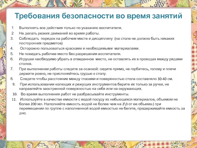 11. Используйте в качестве емкости с водой посуду из небьющихся материалов, объемом не более 200 мл. Наполняйте емкость водой не более чем на 2\3 от ее объема.( при перемещении по группе с наполненной водой емкостью не бегите, придерживайте емкость за дно.