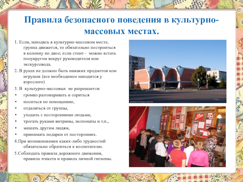 группа движется, то обязательно построиться в колонну по двое; если стоит - можно встать полукругом вокруг руководителя или экскурсовода.