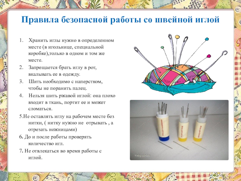 5.Не оставлять иглу на рабочем месте без нитки, ( нитку нужно не отрывать , а отрезать ножницами)