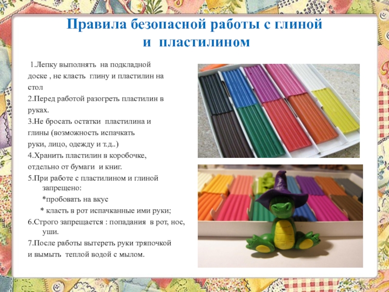 3. После работы с пластилином почистить стекой рабочую доску, крышку стола, если там остались следы от пластилина. Соскрести прилипший к полу пластилин — грязный выброси в мусор, чистый убрать в коробку.