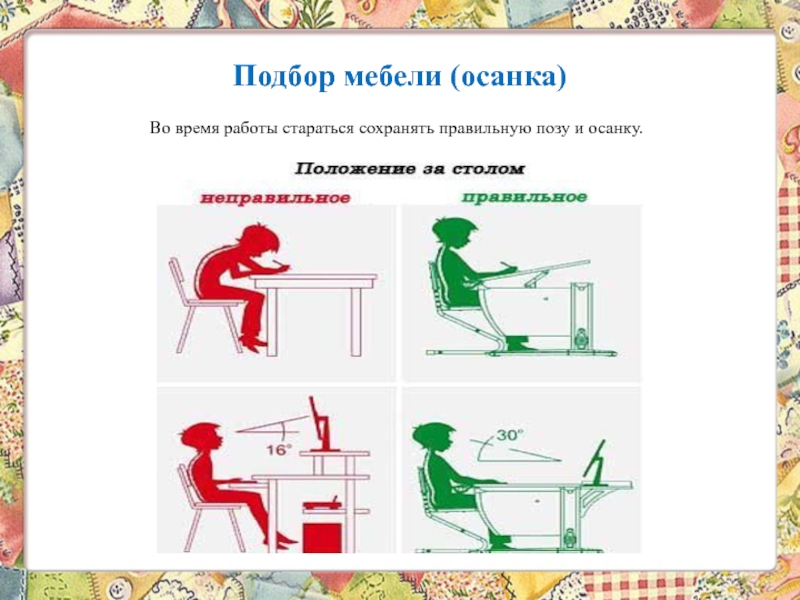 При выполнении работы следите за осанкой: сидите прямо, не горбитесь, голову и плечи держите ровно, не прислоняйтесь грудью к столу.