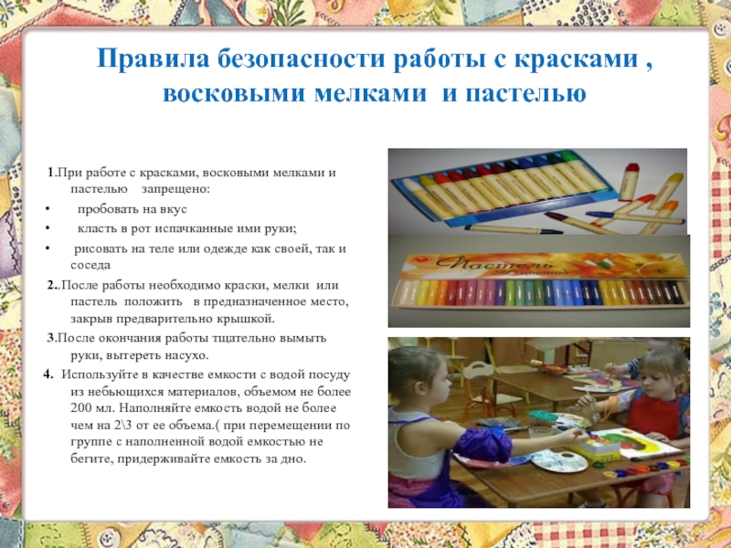 Слайд 6Правила безопасности работы с красками , восковыми мелками и пастелью