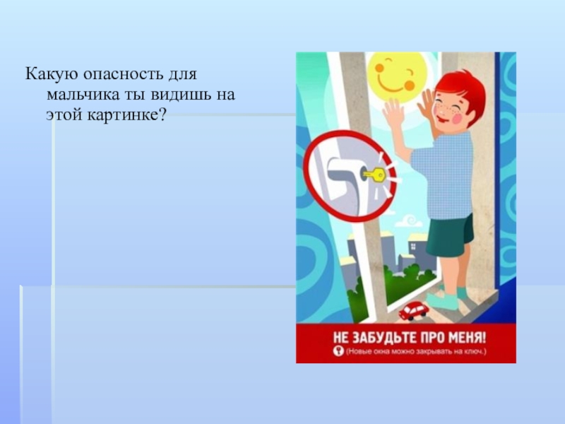 Слайд 7Какую опасность для мальчика ты видишь на этой картинке?