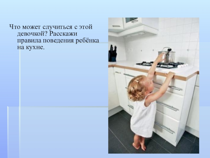 Что может случиться с этой девочкой? Расскажи правила поведения ребёнка на кухне.
