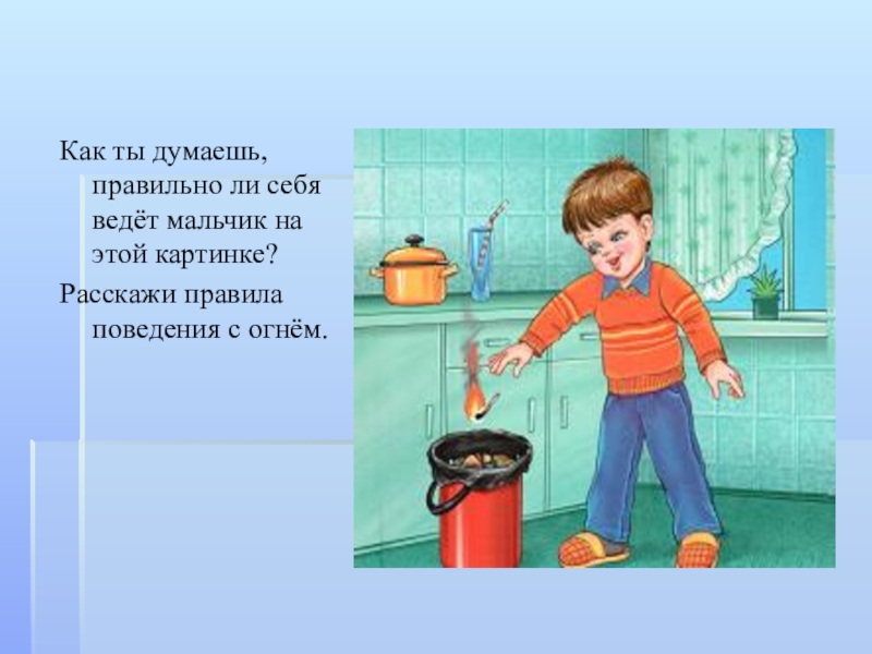 Как ты думаешь, правильно ли себя ведёт мальчик на этой картинке? Расскажи правила поведения с огнём.