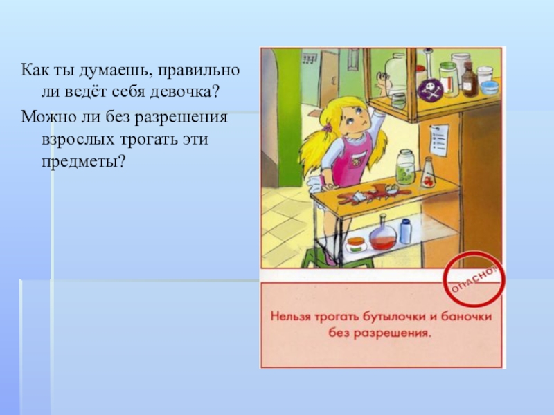 Как ты думаешь, правильно ли ведёт себя девочка? Можно ли без разрешения взрослых трогать эти предметы?