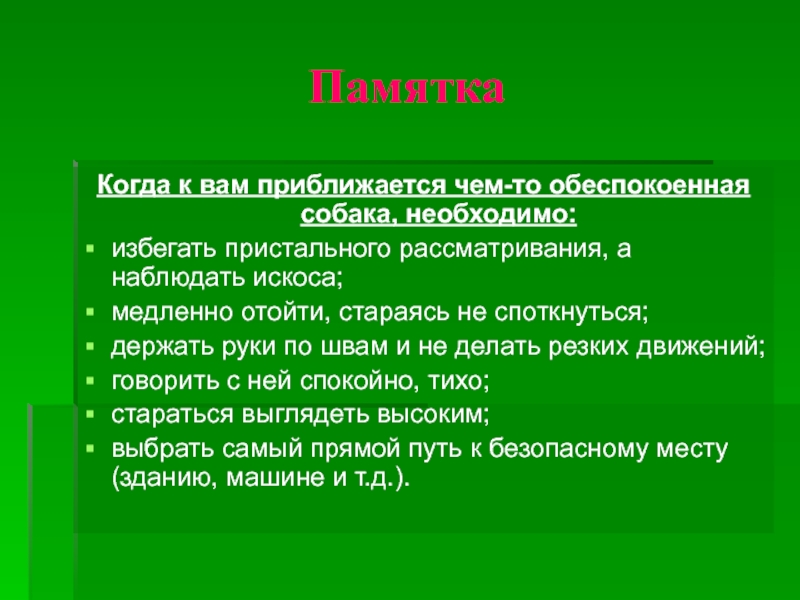 ПамяткаКогда к вам приближается чем-то обеспокоенная собака, необходимо:избегать пристального рассматривания, а наблюдать искоса;медленно отойти, стараясь не споткнуться;держать