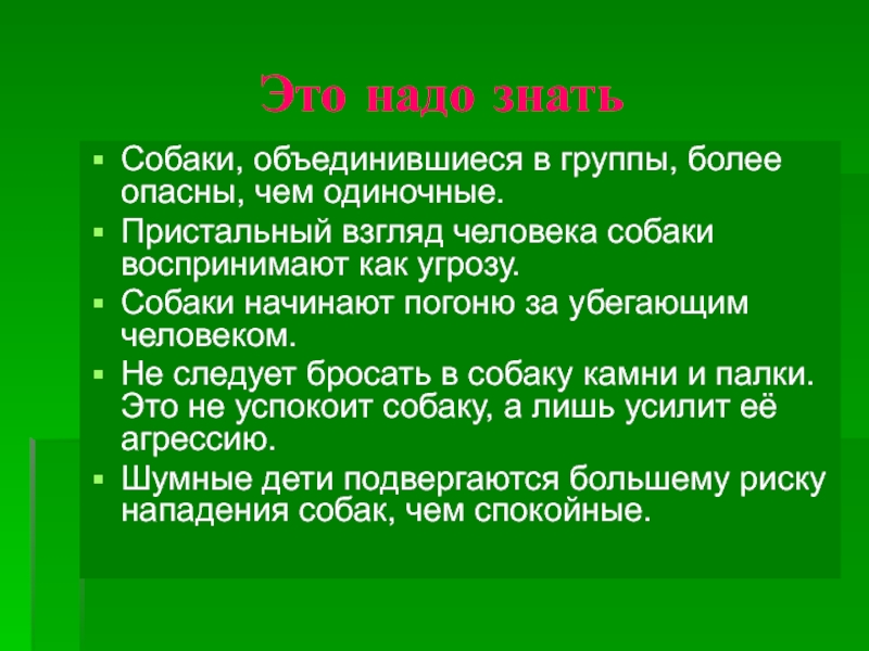 Это надо знатьСобаки, объединившиеся в группы, более опасны, чем одиночные.Пристальный взгляд человека собаки воспринимают как угрозу.Собаки начинают
