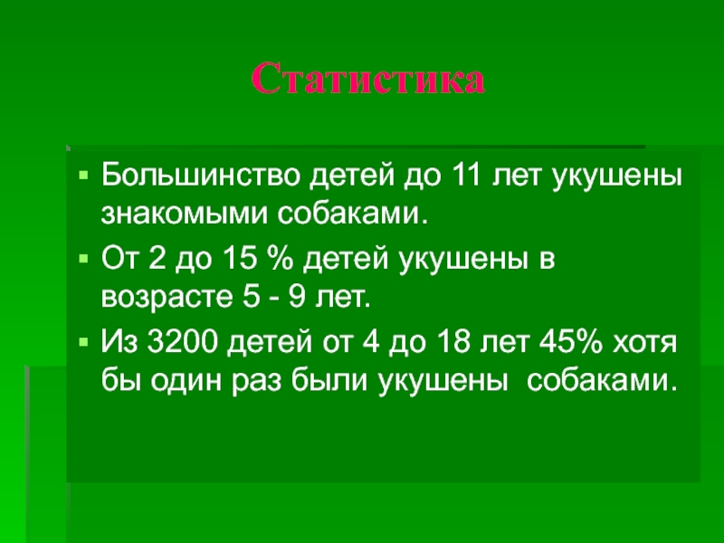 СтатистикаБольшинство детей до 11 лет укушены знакомыми собаками.От 2 до 15 % детей укушены в возрасте 5