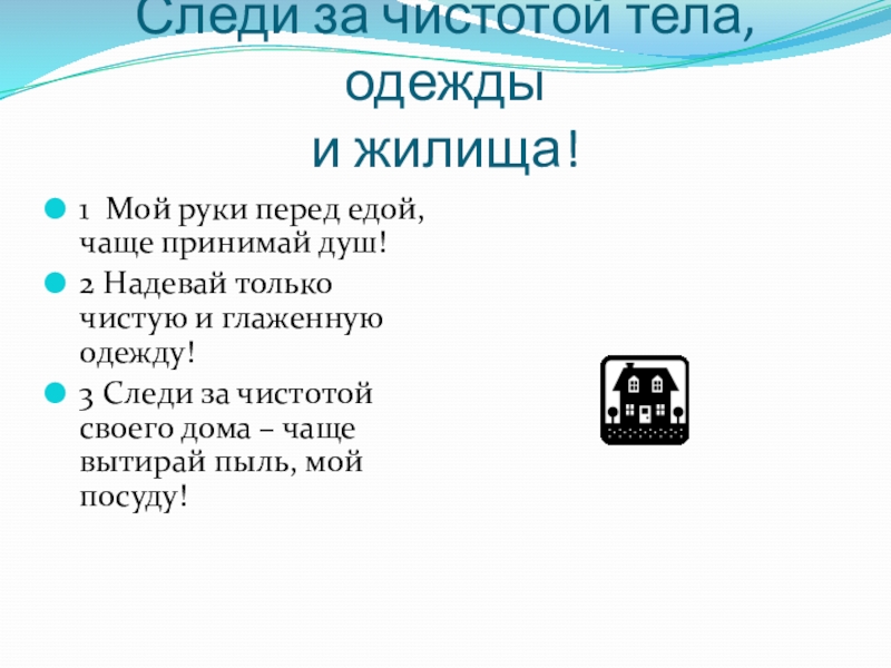 Слайд 6Следи за чистотой тела, одежды и жилища!