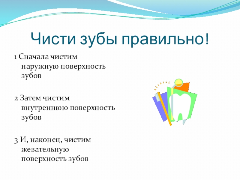 Чисти зубы правильно!1 Сначала чистим наружную поверхность зубов2 Затем чистим внутреннюю поверхность зубов3 И, наконец, чистим жевательную поверхность зубов