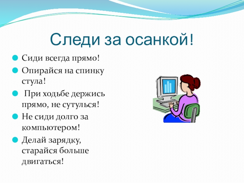 Следи за осанкой!Сиди всегда прямо! Опирайся на спинку стула! При ходьбе держись прямо, не сутулься! Не сиди