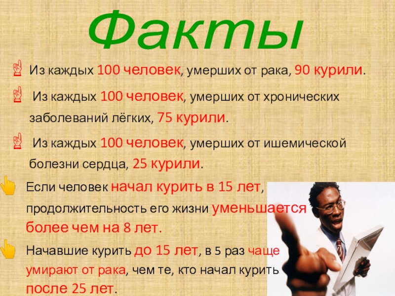 Начавшие курить до 15 лет, в 5 раз чаще умирают от рака, чем те, кто начал курить после 25 лет.