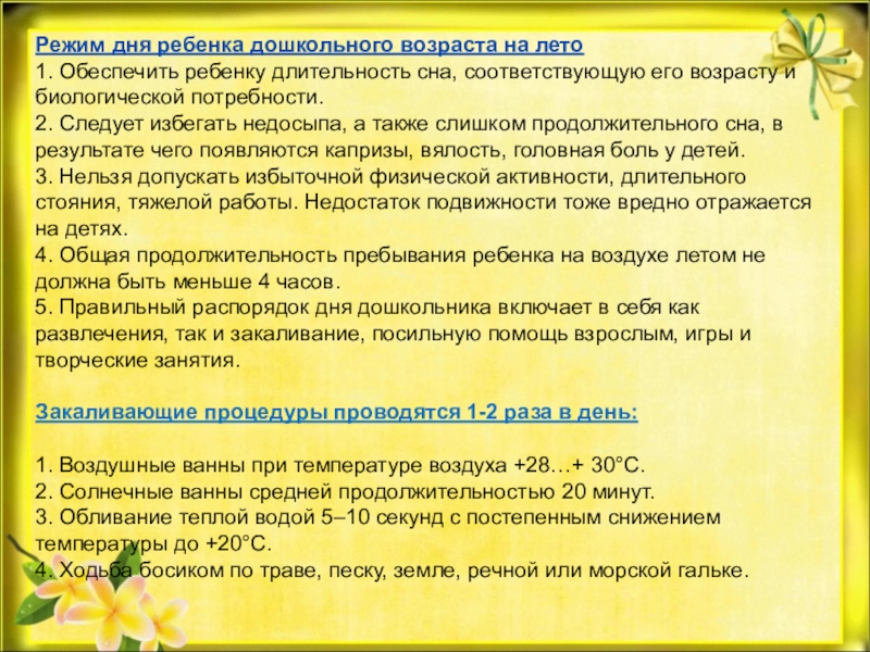 4. Старайтесь соблюдать режим дня, иначе очень трудно к нему возвращаться в сентябре. Не забывайте, что недосыпание развивает неврозы, возрастает утомление. Ребенок должен спать не менее 10 часов.