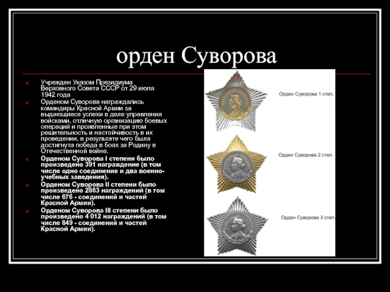 Орденом Суворова II степени было произведено 2863 награждений (в том числе 676 - соединений и частей Красной Армии).