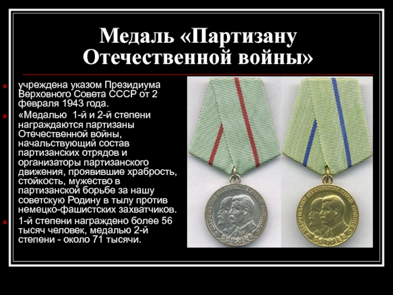 «Медалью 1-й и 2-й степени награждаются партизаны Отечественной войны, начальствующий состав партизанских отрядов и организаторы партизанского движения, проявившие храбрость, стойкость, мужество в партизанской борьбе за нашу советскую Родину в тылу против немецко-фашистских захватчиков.