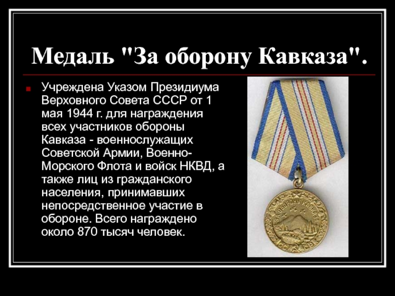 1 мая 1944 г. для награждения всех участников обороны Кавказа - военнослужащих Советской Армии, Военно-Морского Флота и войск НКВД, а также лиц из гражданского населения, принимавших непосредственное участие в обороне. Всего награждено около 870 тысяч человек.