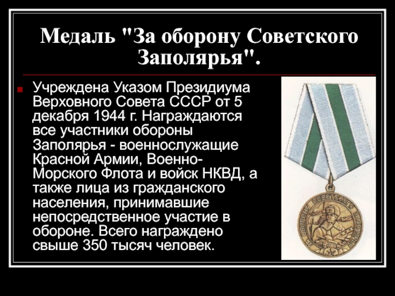 от 5 декабря 1944 г. Награждаются все участники обороны Заполярья - военнослужащие Красной Армии, Военно-Морского Флота и войск НКВД, а также лица из гражданского населения, принимавшие непосредственное участие в обороне. Всего награждено свыше 350 тысяч человек.