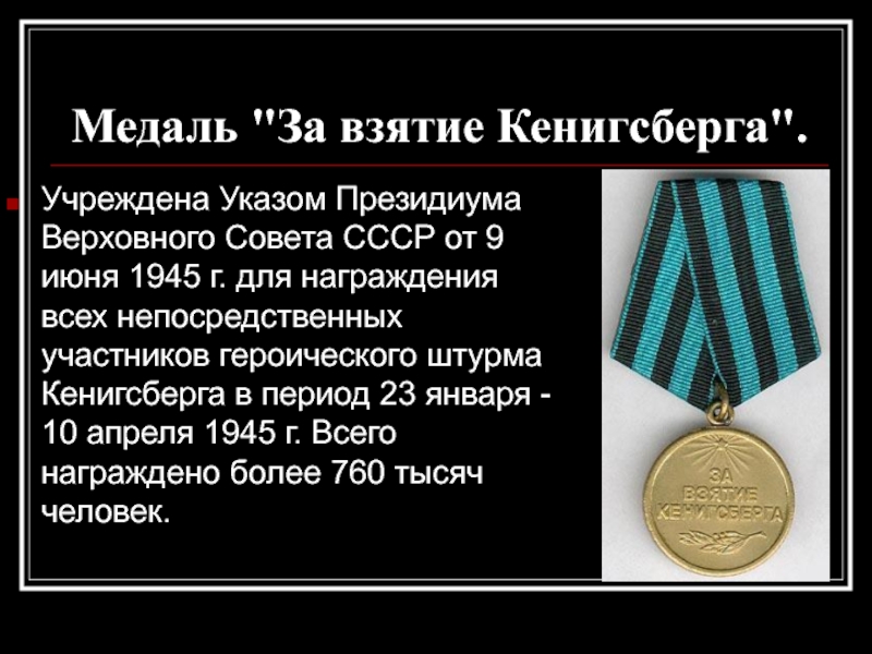 9 июня 1945 г. для награждения всех непосредственных участников героического штурма Кенигсберга в период 23 января - 10 апреля 1945 г. Всего награждено более 760 тысяч человек.