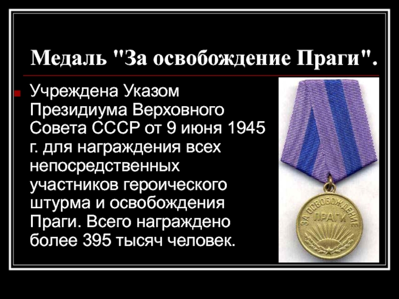 9 июня 1945 г. для награждения всех непосредственных участников героического штурма и освобождения Праги. Всего награждено более 395 тысяч человек.