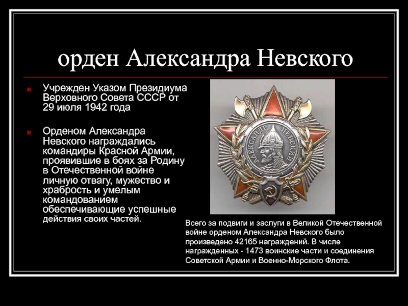 Всего за подвиги и заслуги в Великой Отечественной войне орденом Александра Невского было произведено 42165 награждений. В числе награжденных - 1473 воинские части и соединения Советской Армии и Военно-Морского Флота.