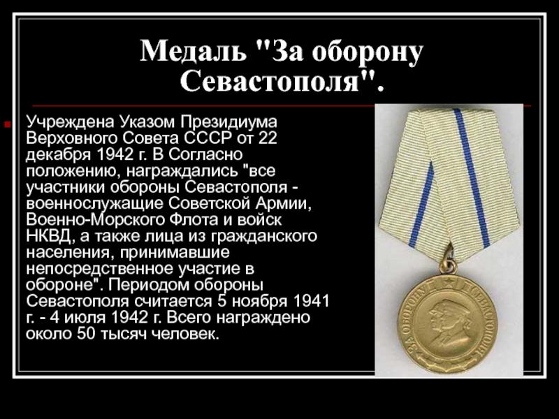 22 декабря 1942 г. В Согласно положению, награждались "все участники обороны Севастополя - военнослужащие Советской Армии, Военно-Морского Флота и войск НКВД, а также лица из гражданского населения, принимавшие непосредственное участие в обороне". Периодом обороны Севастополя считается 5 ноября 1941 г. - 4 июля 1942 г. Всего награждено около 50 тысяч человек.