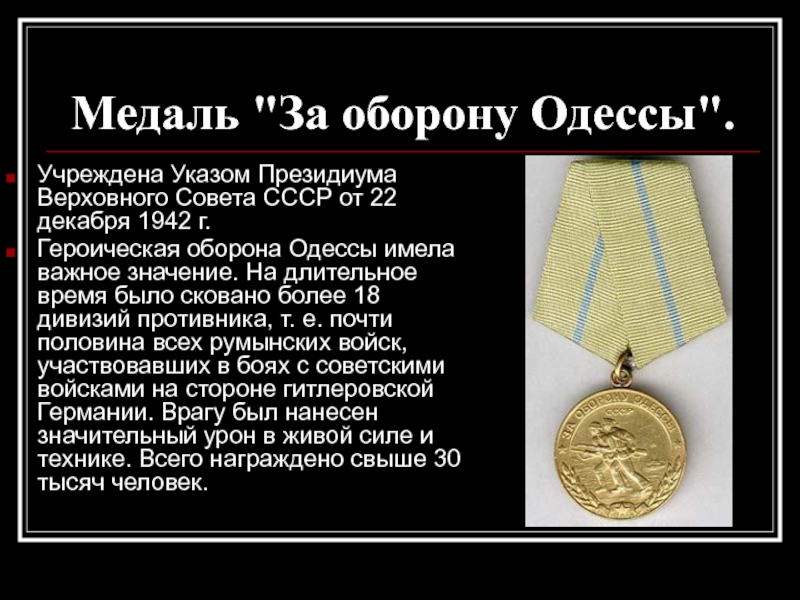 1 мая 1944 г. Сражение под Москвой было одним из крупнейших сражений Великой Отечественной войны. Вручалась как военнослужащим, так и гражданским лицам, участвовавшим в обороне столицы. Всего было награждено свыше одного миллиона человек.