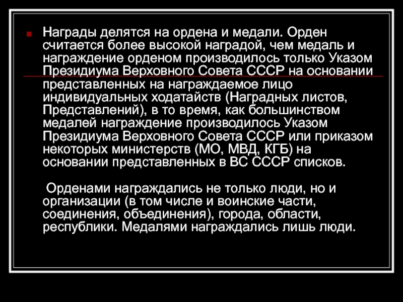 чем медаль и награждение орденом производилось только Указом Президиума Верховного Совета СССР на основании представленных на награждаемое лицо индивидуальных ходатайств (Наградных листов, Представлений), в то время, как большинством медалей награждение производилось Указом Президиума Верховного Совета СССР или приказом некоторых министерств (МО, МВД, КГБ) на основании представленных в ВС СССР списков.