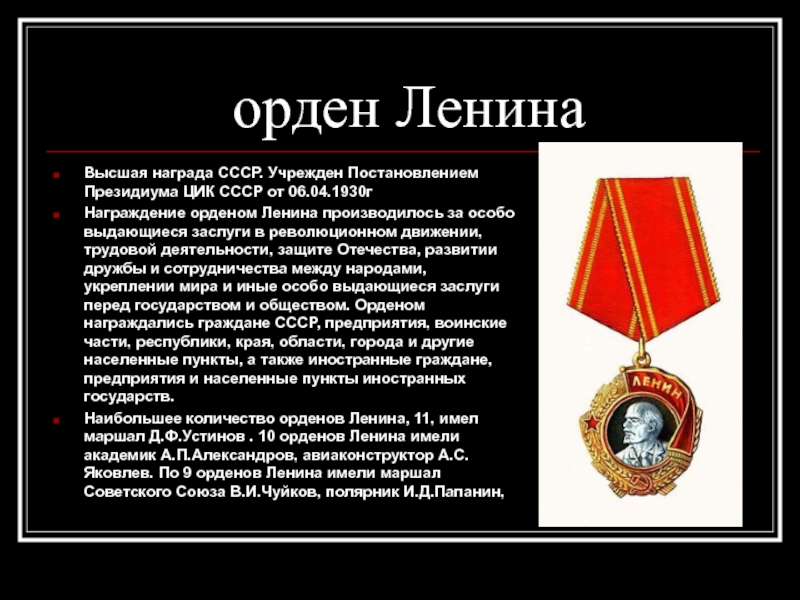 Наибольшее количество орденов Ленина, 11, имел маршал Д.Ф.Устинов . 10 орденов Ленина имели академик А.П.Александров, авиаконструктор А.С.Яковлев. По 9 орденов Ленина имели маршал Советского Союза В.И.Чуйков, полярник И.Д.Папанин,