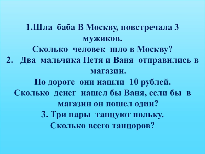 1.Шла баба В Москву, повстречала 3 мужиков.Сколько человек шло в Москву?Два мальчика Петя и Ваня отправились в
