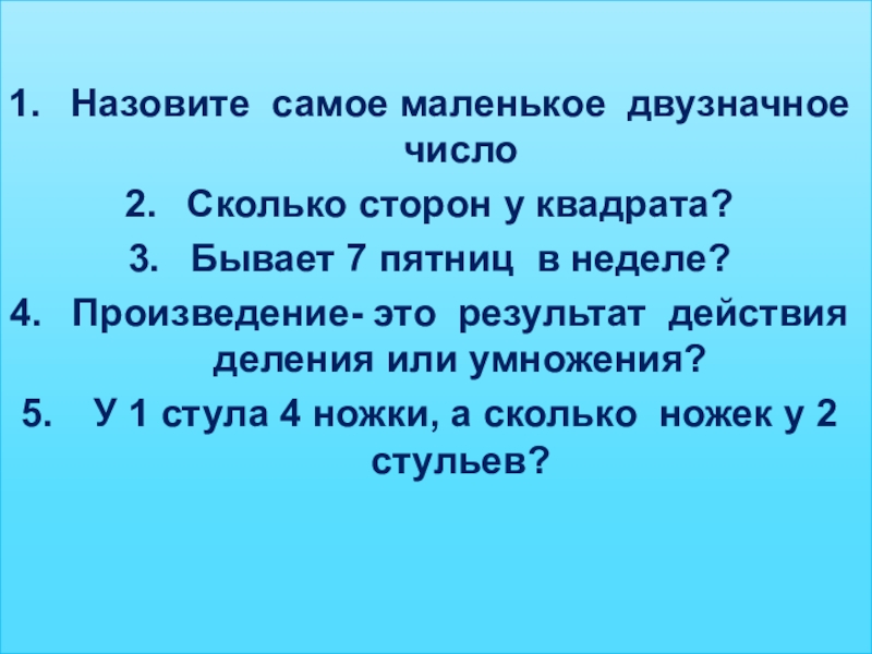 Назовите самое маленькое двузначное числоСколько сторон у квадрата?Бывает 7 пятниц в неделе?Произведение- это результат действия деления или
