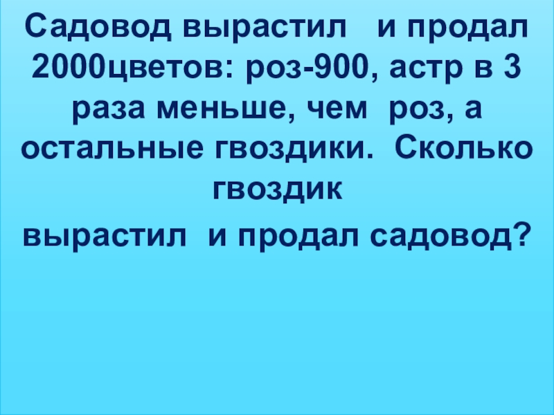Садовод вырастил  и продал 2000цветов: роз-900, астр в 3 раза меньше, чем роз, а остальные гвоздики.