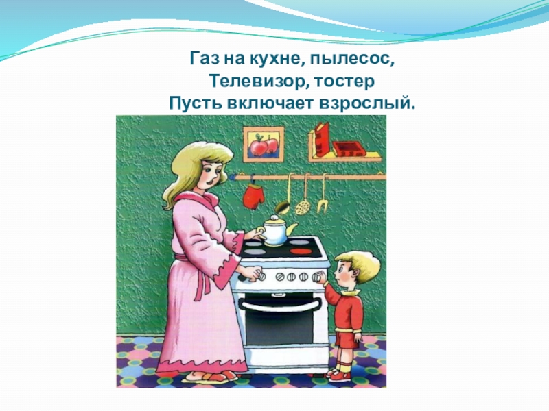 Слайд 7 Газ на кухне, пылесос, Телевизор, тостер Пусть включает взрослый.