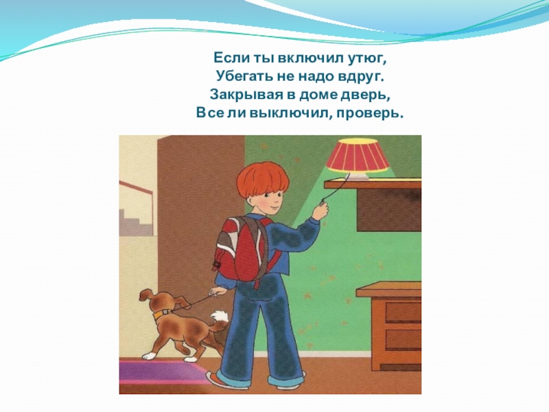 Слайд 10 Если ты включил утюг, Убегать не надо вдруг. Закрывая в доме
