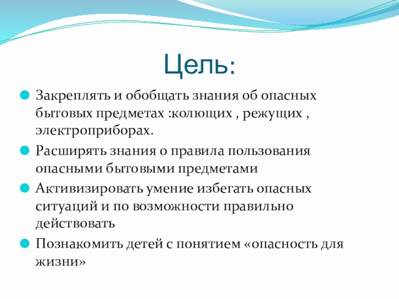 Цель:Закреплять и обобщать знания об опасных бытовых предметах :колющих , режущих ,электроприборах.Расширять знания о правила пользования опасными бытовыми предметамиАктивизировать умение избегать опасных ситуаций и по возможности правильно действоватьПознакомить детей с понятием «опасность для жизни»