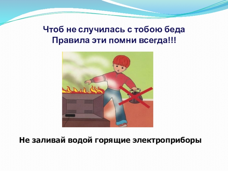Чтоб не случилась с тобою беда Правила эти помни всегда!!!Не заливай водой горящие электроприборы