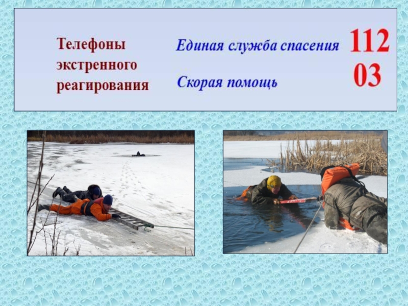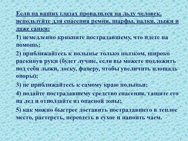 4) подайте пострадавшему средство спасения, тащите его на лед и отползайте из опасной зоны;