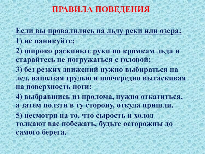ПРАВИЛА ПОВЕДЕНИЯ  Если вы провалились на льду реки или озера: 1) не паникуйте;2) широко раскиньте руки по