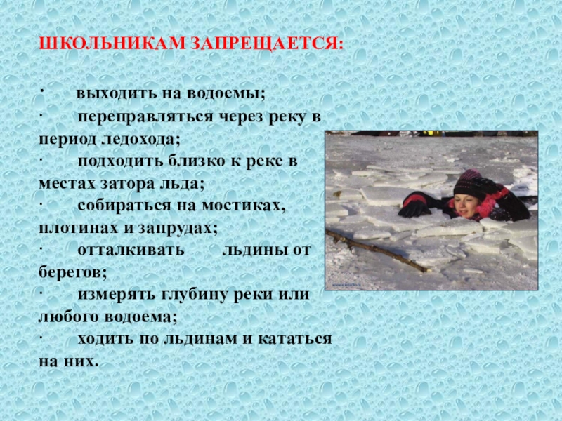 ШКОЛЬНИКАМ ЗАПРЕЩАЕТСЯ:   ·     выходить на водоемы; ·       переправляться через реку в период ледохода; ·       подходить близко к реке в