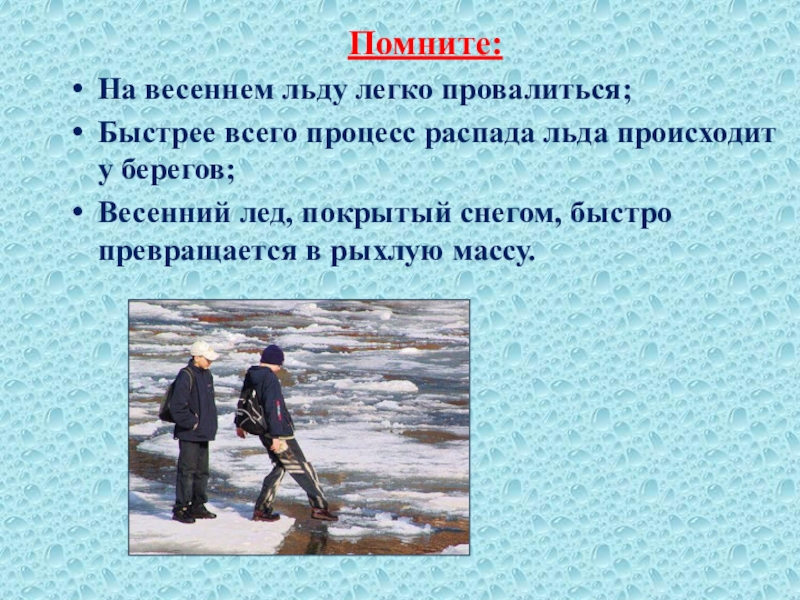 Помните:На весеннем льду легко провалиться;Быстрее всего процесс распада льда происходит у берегов;Весенний лед, покрытый снегом, быстро превращается