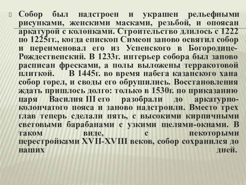 опоясан аркатурой с колонками. Строительство длилось с 1222 по 1225гг., когда епископ Симеон заново освятил собор и переименовал его из Успенского в Богородице-Рождественский. В 1233г. интерьер собора был заново расписан фресками, а полы выложены терракотовой плиткой. В 1445г. во время набега казанского хана собор горел, и своды его обрушились. Восстановления ждать пришлось долго: только в 1530г. по приказанию царя Василия III его разобрали до аркатурно-колончатого пояса и заново надстроили. Вместо трех глав теперь сделали пять, с высокими кирпичными световыми барабанами с узкими щелями-окнами. В таком виде, с некоторыми перестройками XVII-XVIII веков, собор сохранился до наших дней.
