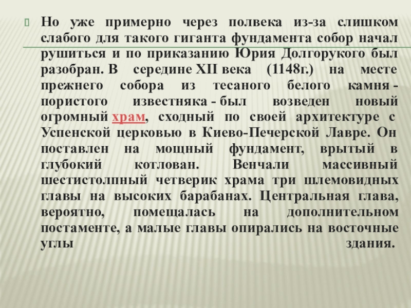 фундамента собор начал рушиться и по приказанию Юрия Долгорукого был разобран. В середине XII века (1148г.) на месте прежнего собора из тесаного белого камня -пористого известняка - был возведен новый огромный храм, сходный по своей архитектуре с Успенской церковью в Киево-Печерской Лавре. Он поставлен на мощный фундамент, врытый в глубокий котлован. Венчали массивный шестистолпный четверик храма три шлемовидных главы на высоких барабанах. Центральная глава, вероятно, помещалась на дополнительном постаменте, а малые главы опирались на восточные углы здания.