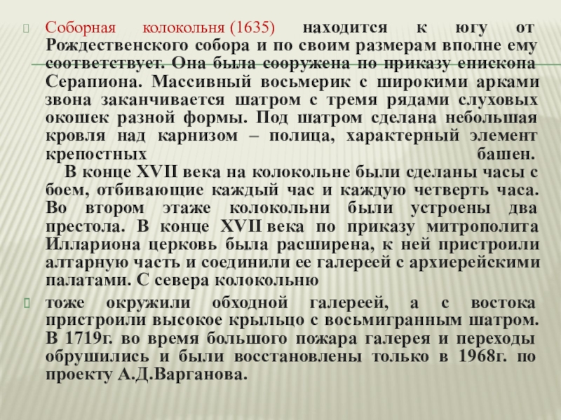 Слайд 13Соборная колокольня (1635) находится к югу от Рождественского собора и по своим