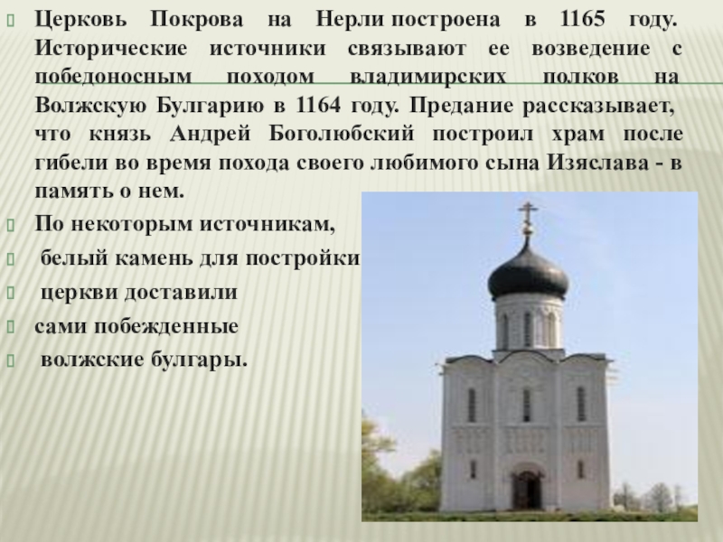 Слайд 4Церковь Покрова на Нерли построена в 1165 году. Исторические источники связывают ее