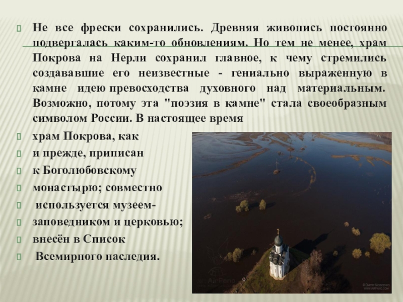 тем не менее, храм Покрова на Нерли сохранил главное, к чему стремились создававшие его неизвестные - гениально выраженную в камне идею превосходства духовного над материальным. Возможно, потому эта "поэзия в камне" стала своеобразным символом России. В настоящее время